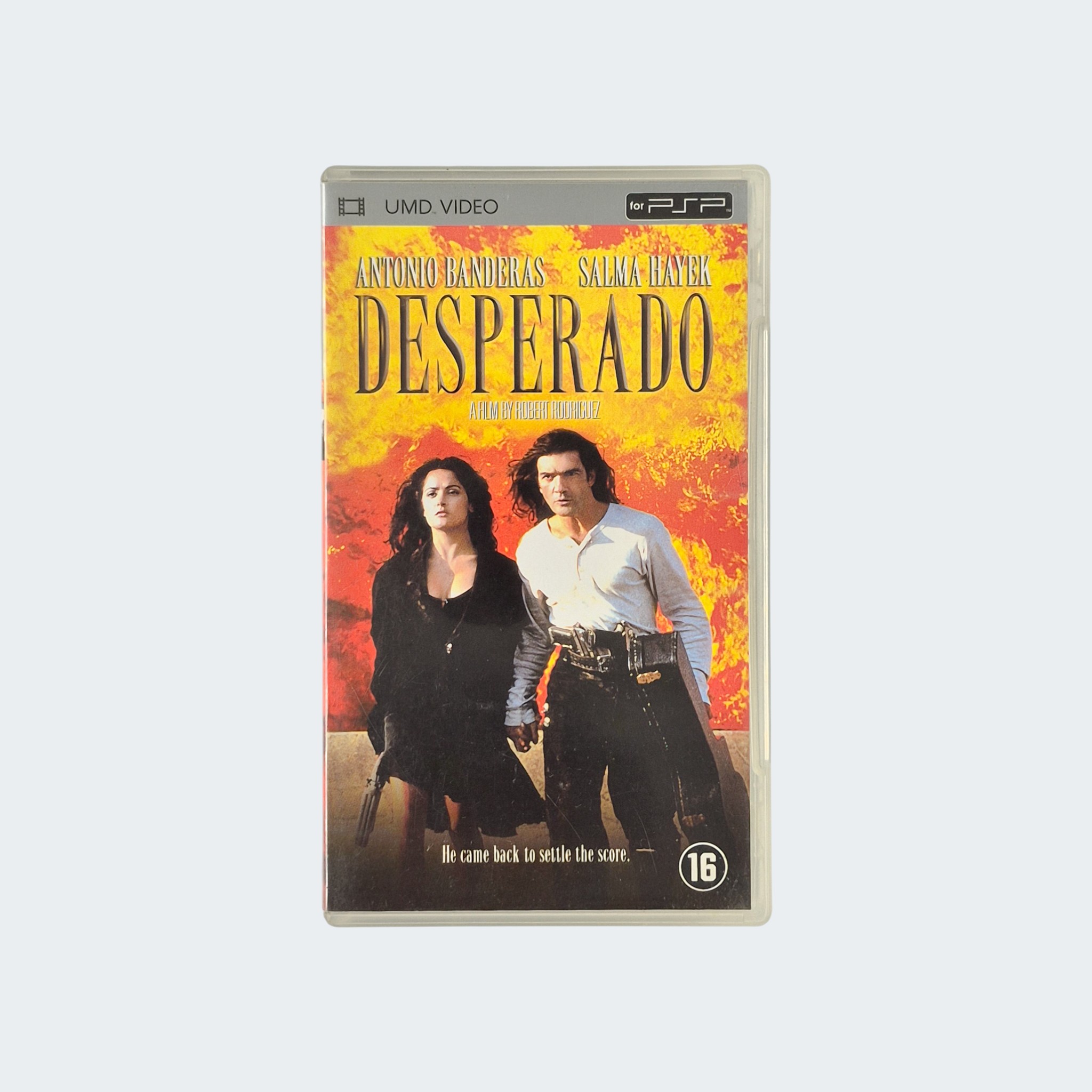 De fysieke UMD-schijf komt in een stevige hoes met de originele filmaffiche als artwork — herkenbaar en retro tegelijk. Het is een stukje jaren 2000-nostalgie dat steeds moeilijker te vinden is, zeker in goede staat. Als je PSP-videoverzameling toe is aan wat ruige actie met een scherp randje, dan is Desperado precies de titel die je zoekt.
