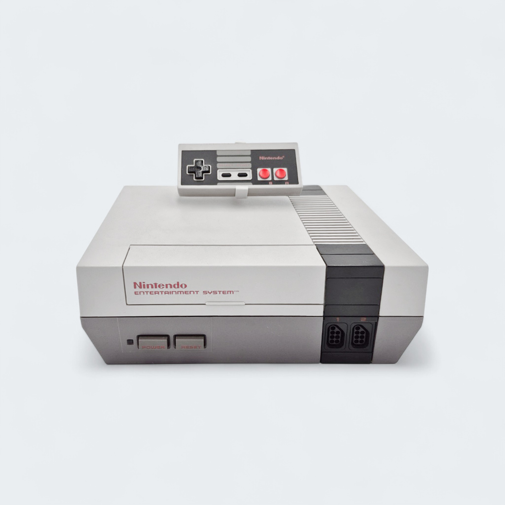Deze houder biedt plaats aan één console en twee controllers, met een perfecte pasvorm die voorkomt dat de apparaten verschuiven. Of je nu je NES tentoonstelt in een vitrinekast, op een plank of in een retro-gameroom, de stand zorgt voor een opgeruimde en professionele uitstraling. De controllers rusten in aparte uitsparingen, zodat de kabels netjes kunnen worden opgeborgen zonder te verstrengelen. De console zelf wordt licht gekanteld gepresenteerd, waardoor het iconische “Nintendo Entertainment System”-logo goed zichtbaar blijft.